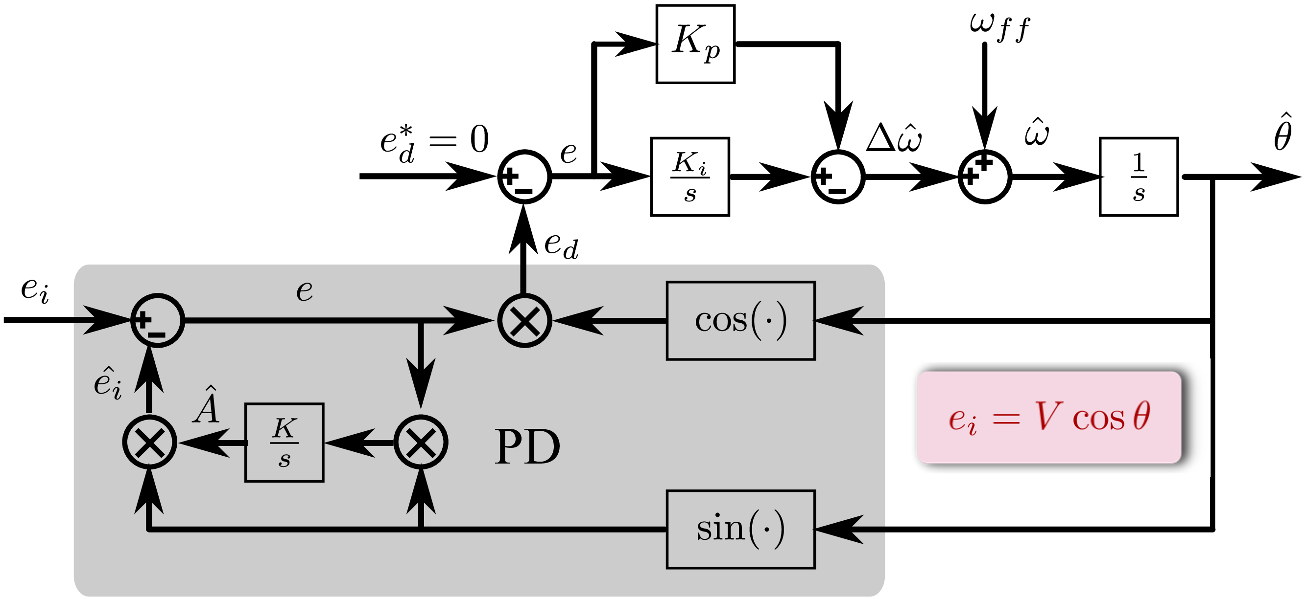 仔细端详该控制结构框图,会发现在稳态时,有\(\hat{A} \approx V\), \(\hat{\theta} \approx \theta\),在使用小信号模型分析方法,可以简化公式\(\eqref{eq:SingleEpllPDSignal}\),得到一个有关相位差的公式。