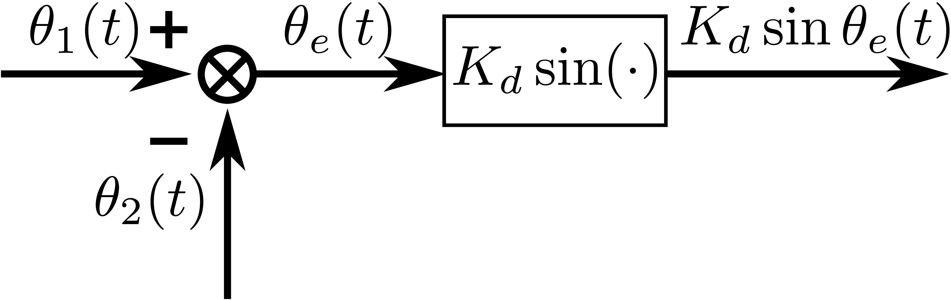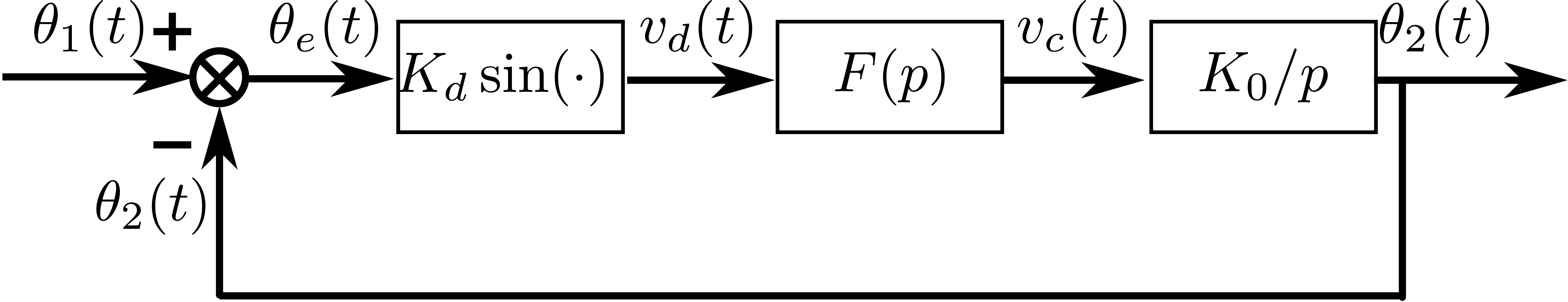 \[ \begin{equation} \theta_e(t)=\theta_1(t) - \theta_2(t)=\theta_1(t) - K_0F(p) \frac{v_d(t)}{p} =\theta_1(t) - K_0 K_d F(p) \frac{1}{p} \sin \theta_e(t) \end{equation} \]